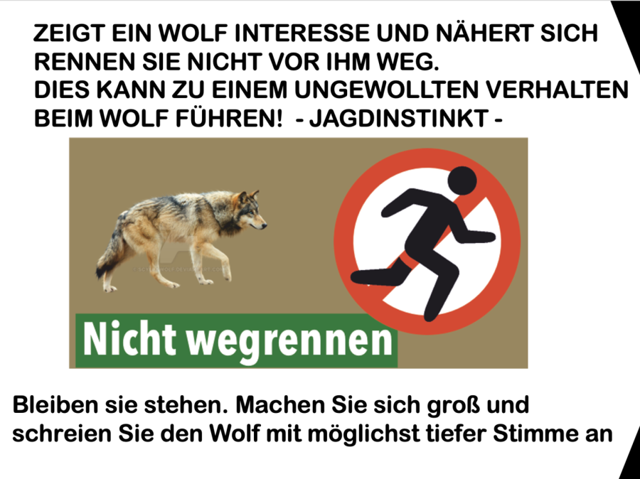 Kommt ein Wolf näher machen Sie sich Groß und Rufen sie mit möglichst dunkler Stimme. Zur not nehmen sie Gegenstände und werfen sie diese in Richtung des Wolfs um ihn zu vertreiben.